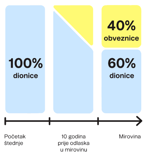 Ovakvu strukturu portfelja imat ćete sve do 55. godine života, nakon čega će (ukoliko se ne odlučite za povlačenje novca) Finax za vas automatski i postepeno smanjujivati rizičnost (povećavajući udio obveznica) u sljedećih 10 godina pred (starosnu) mirovinu. Konačan omjer 60/40 postiže se kada navršite 65 godina života i takav portfelj zadržavate sve do željenog povlačenja sredstava (tzv. isplatna faza) kako je ilustrirano donjom slikom. To je upravo omjer koji planiram i sama zadržati u mirovinskom portfelju kojeg sam godinama (samostalno) kreirala.